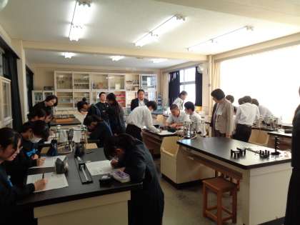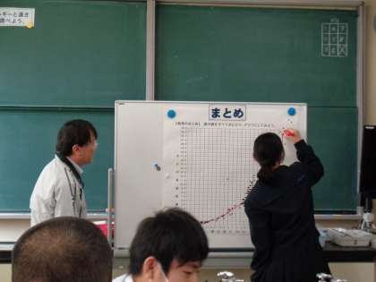 3年生の理科の授業です。今日は実験をしています。各班のの結果を1枚のグラフにして、考察しています。先生方がたくさん参観されました。