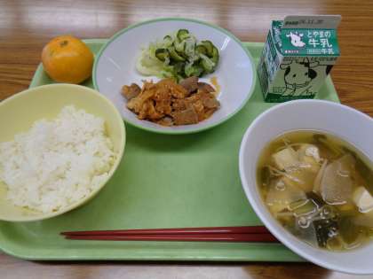 メニューは、ごはん、牛乳、豚肉とレバーのケチャップソース炒め、そえ野菜、すまし汁、みかんでした。美味しくいただきました。