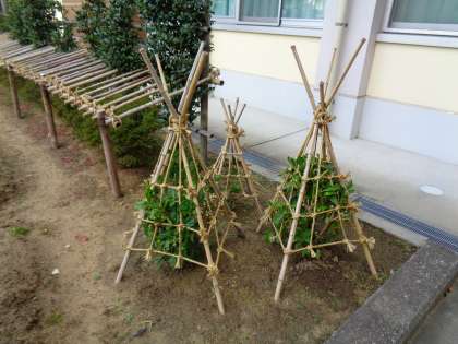 冬が近づいています。用務員さんが雪囲いを進めています。ありがとうございます。
