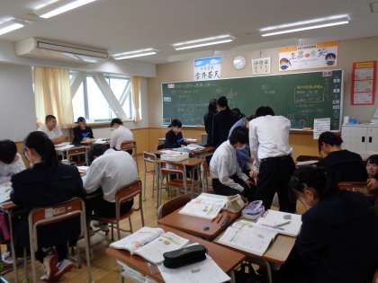 3年生の授業です。数学と社会です。数学では、分かるまで質問したり教えあったりしています。