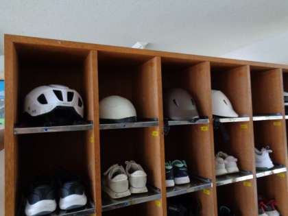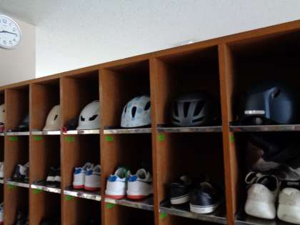 生徒用の下駄箱に自転車通学生のヘルメットが整頓されていました。以前は学校指定のヘルメットでしたが、今は各自が購入しています。色や模様など好みの物を選んで使っています。