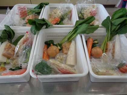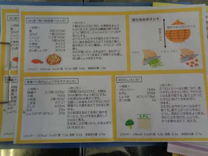 今日は、1年生が食育講座をしています。地域の方が7名来校され、食生活について考え、調理実習をします。今日は給食ではなく、自分たちが作った料理を食べる予定です。実習の前に、塩分摂取のことやバランスのよい食事について学習しました。実習の準備も地域の方に協力していただきました。