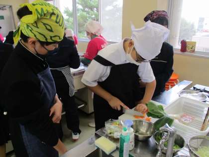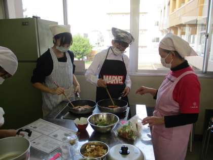 後半は調理実習を行いました。今回の献立は「ぽん酢で鮭の南蛮漬け」「もやしとブロッコリーのおひたし」「厚揚げの具沢山みそ汁」です。各班に講師の方がついていただき、実習を行いました。普段、調理をしない生徒も丁寧に教えてもらいながら実習をしていました。出来上がった料理を「美味しい」「家でも作りたい」と話して食べていました。