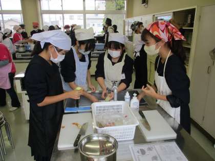 後半は調理実習を行いました。今回の献立は「ぽん酢で鮭の南蛮漬け」「もやしとブロッコリーのおひたし」「厚揚げの具沢山みそ汁」です。各班に講師の方がついていただき、実習を行いました。普段、調理をしない生徒も丁寧に教えてもらいながら実習をしていました。出来上がった料理を「美味しい」「家でも作りたい」と話して食べていました。
