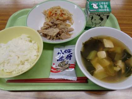 今日のメニューは、ごはん、牛乳、焼肉丼、ナムル、中華スープ、味付け小魚でした。美味しくいただきました。