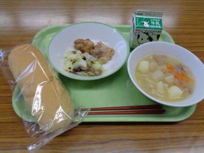 メニューは、コッペパン、牛乳、鶏肉の照り焼き、ミックスビーンズのマリネ、野菜のスープ煮でした。美味しくいただきました。