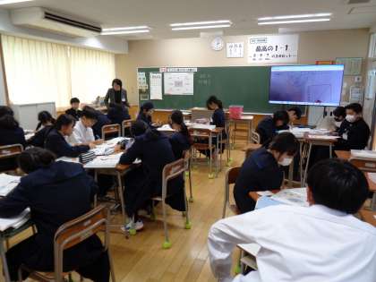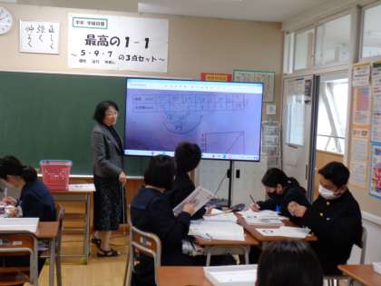 1年生の数学です。今日はたくさんの先生が参観されました。グループで真剣に考えています。