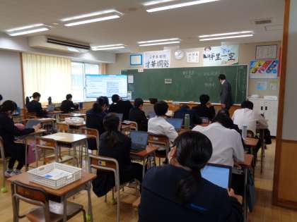 2年生の社会と英語です。授業の終わりに振り返りをしています。