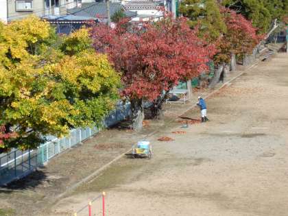 きれいに紅葉した葉が落ちてきました。用務員さんが落ち葉を片付けておられました。ありがとうございます。
