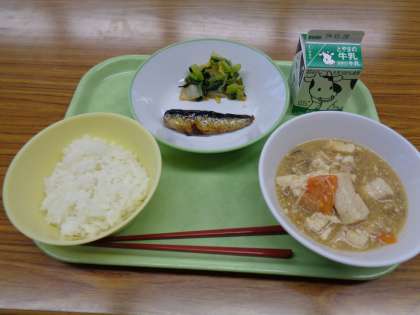 今日のメニューは、ごはん、牛乳、いわしの生姜煮、白菜ひたし、豆腐ときのこのあんかけ煮でした。美味しくいただきました。