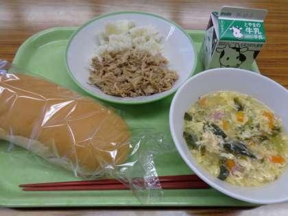 メニューはコッペパン、牛乳、鶏肉の甘辛煮、こふきいも、卵のふわふわスープでした。美味しくいただきました。
