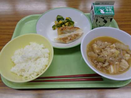 メニューは、ごはん、牛乳、焼きぎょうざ、コーン和え、韓国風すきやきでした。美味しくいただきました。