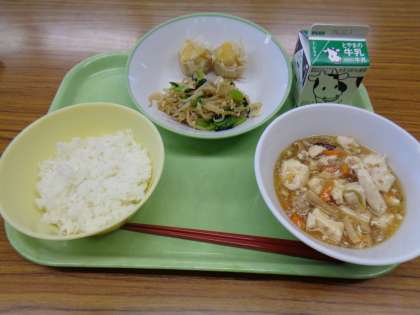 メニューは、ごはん、牛乳、にんじんシューマイ、小松菜の大豆そぼろ和え、マーボー豆腐でした。美味しくいただきました。