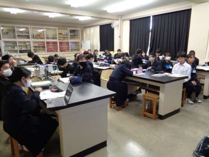 1年生は理科です。理科室で光の進み方の学習をしてます。