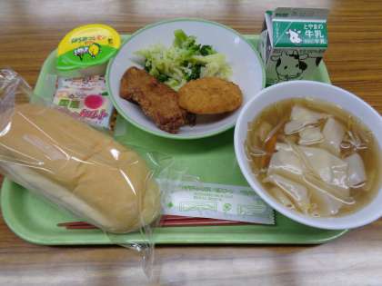 今日は、選択給食です。コッペパン、牛乳、そえ野菜、ワンタンスープは全員共通のメニューです。豚肉の米粉揚げ、えびカツの選択とデザートでは、はちみつレモンゼリー、ももタルトから選択しました。美味しくいただきました。