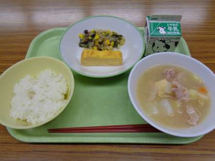 今日のメニューはごはん、厚焼き卵、野菜のオイスターソース炒め、豚汁でした。美味しくいただきました。