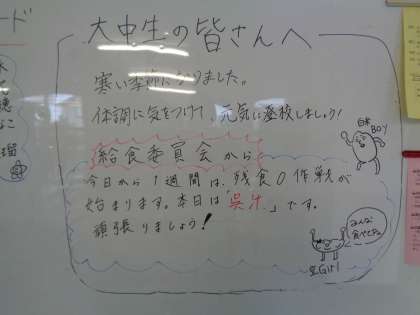 生徒会のお知らせが生徒玄関前のホワイトボードに記入されています。