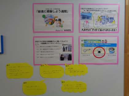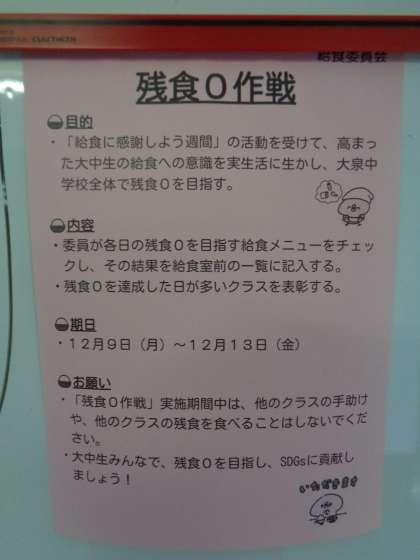 給食委員会の取組です。今週は残量ゼロ週間です。配膳室前にも掲示物が貼られています。皆さん見てくださいね。