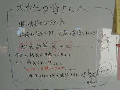 生徒玄関のホワイトボードです。今週は、給食委員会が残量ゼロを目指してます。