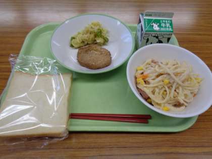 メニューは食パン(減)、牛乳、鶏つくね、切干大根のサラダ、クリームスパゲッティでした。美味しくいただきました。