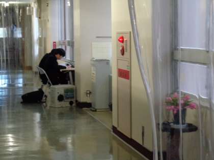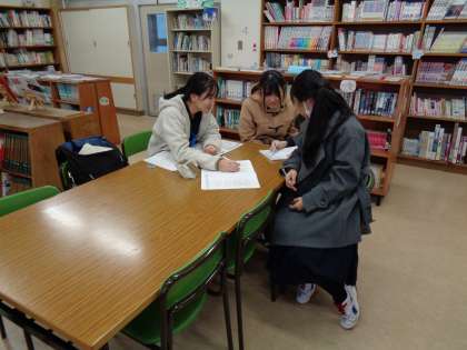 3年生が職員室前の廊下や図書室で学習しています。学校での学習がはかどるようです。