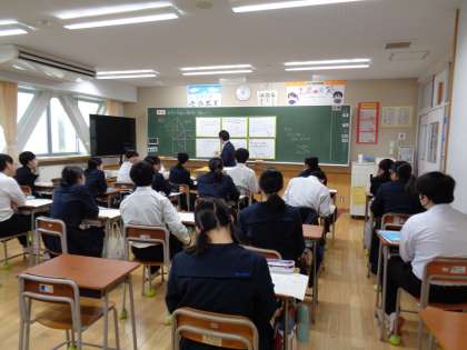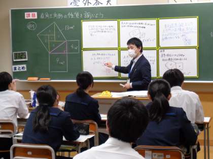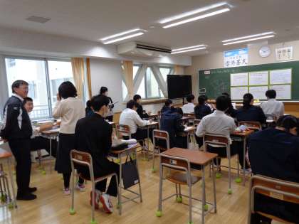 3年生の数学です。今日は、たくさんの先生が参観に来られました。意欲的に取り組んでいます。