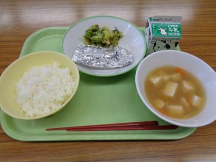 メニューはごはん、牛乳、さばの銀紙焼き、昆布和え、白玉汁でした。美味しくいただきました。