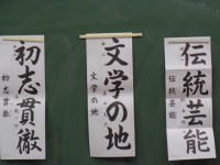英語の授業で書いた日本文化を紹介する英文とイラストが掲示されています。