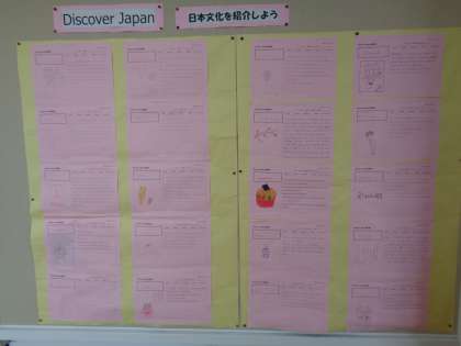 英語の授業で書いた日本文化を紹介する英文とイラストが掲示されています。