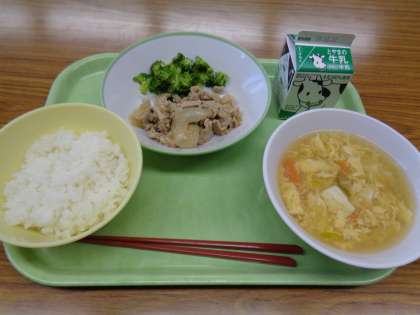 メニューは、ごはん、牛乳、豚肉のジャンロー、ゆでブロッコリー、かきたま汁でした。美味しくいただきました。