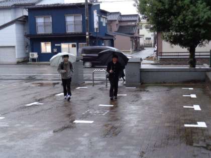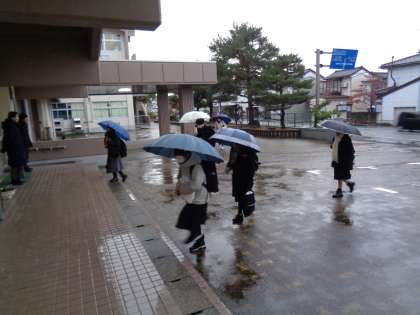今朝は雨が降っています。傘を差しての登校です。自転車通学生は、合羽を着用しています。自転車通学生も徒歩通学生も、時間に余裕をもって安全に登校しましょう。