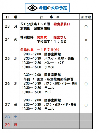 今週は、24日(火)に終業式があります。机やロッカーの中等、身の回りの整理・整頓をしておきましょう。また、冬休み中も引き続き図書室開放を行っています。ぜひ、読書や学習の場として活用してほしいと思います。