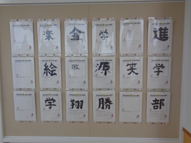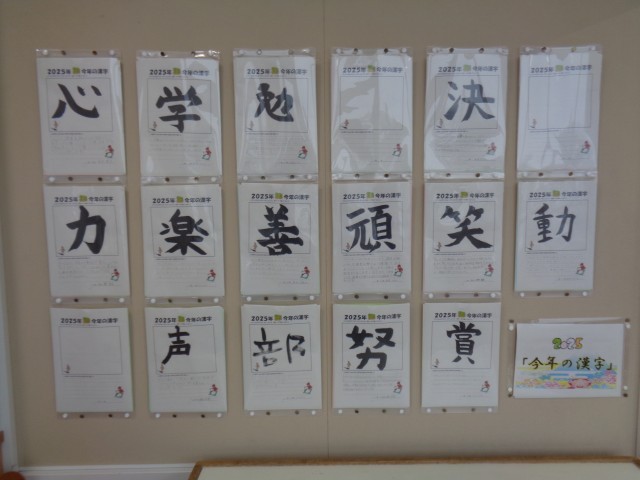 廊下には昨日の書き初めが・・・?今年の漢字を書きました