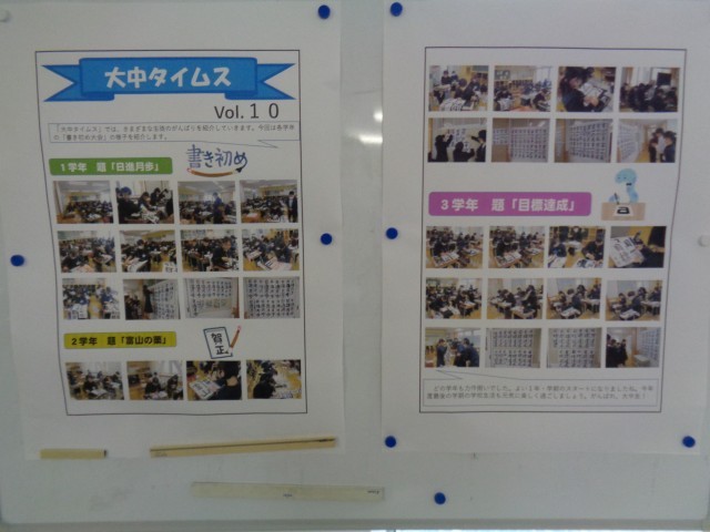 3学期が始まりました。昨日の様子を写真で掲示しました。また、正面玄関にはスライドショーで写真を流しています。生徒の皆さんの下駄箱は、毎日きれいに整頓されています。さすが大中生!!