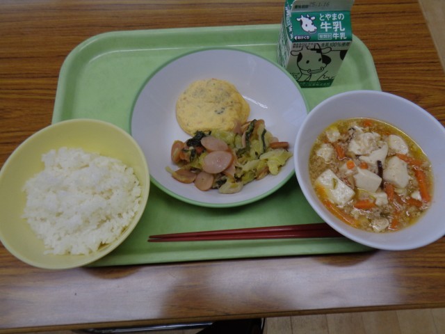 今日は、3学期最初の給食です。メニューは、ごはん、牛乳、かにたま、チンゲンサイソテー、マーボー豆腐でした。美味しくいただきました。3年生は、給食を食べられる日が少なくなってきました。毎日残さず美味しくいただきましょう。