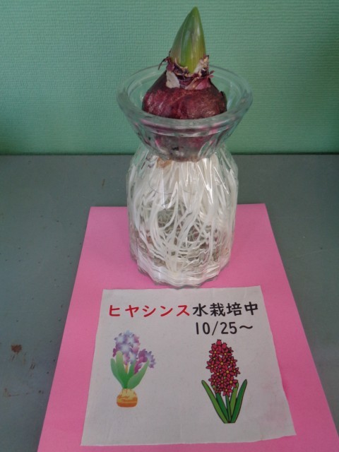 職員室前で栽培しているヒヤシンスの芽が大きくなってきました。成長が楽しみです。