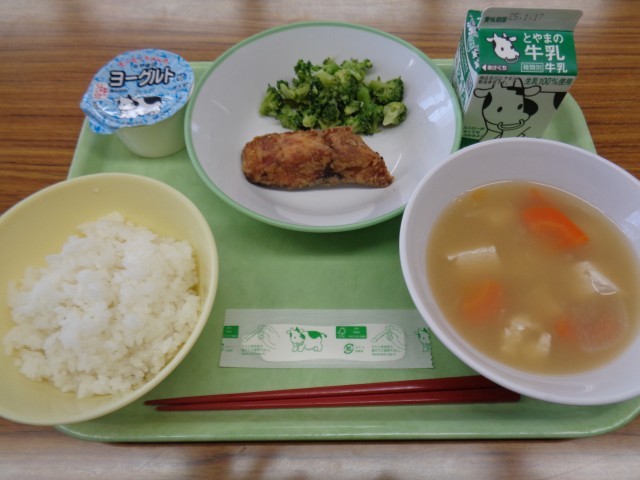 今日のメニューは、ごはん、牛乳、しいらのえごまだれ、ゆでキャベツ、すいとん、ヨーグルトでした。美味しくいただきました。