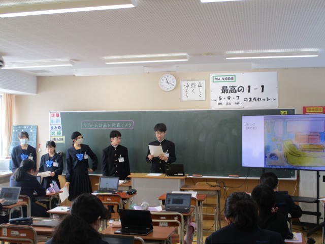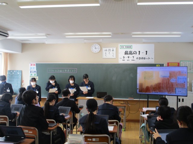 1年生の家庭科の授業で、「リフォーム大作戦発表会」を行いました。今まで住居領域で学習した内容を生かし、アニメ「サザエさん」の家をどのようにすると住みやすくるかを各自で考えました。今日は、その内容をモニターで提示しながら工夫点を班ごとに発表しました。災害対策を考えたり、高齢者や幼児が家庭内事故に遭わないよう考えたりして、住みやすくなる工夫を発表していました。