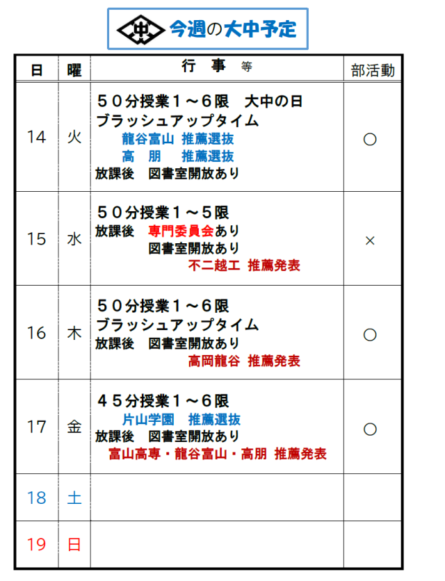 今週は、授業を中心に進んでいきます。冬休みの生活から学校の生活リズムにしっかと整えてください。
