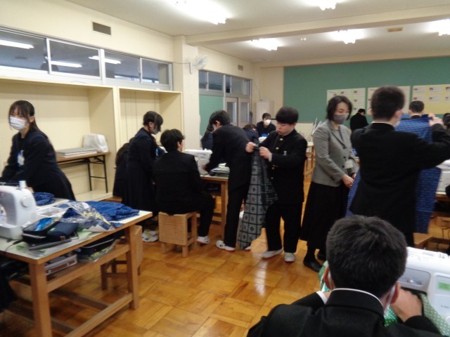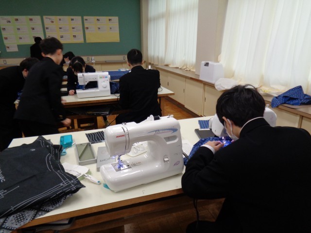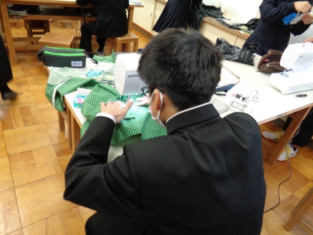 2年生の授業です。国語と技術家庭科です。ミシンを使っての実習なので、協力しています。完成が楽しみですね。