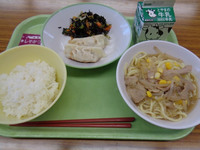 今日のメニューは、ごはん、牛乳、焼きぎょうざ、鉄たっぷりサラダ、サッポロラーメン、しそかつおふりかけでした。美味しくいただきました。