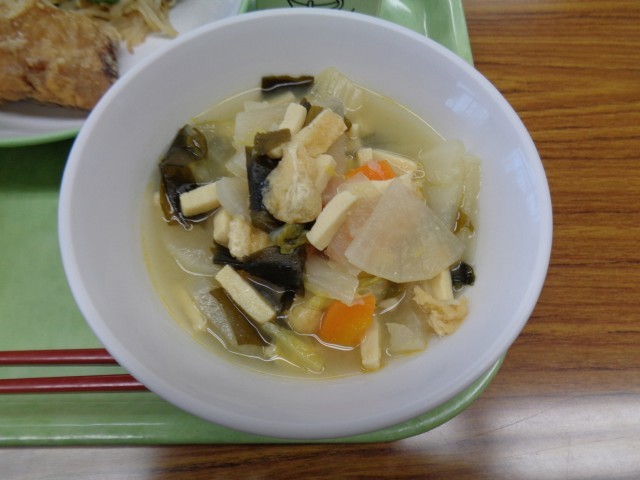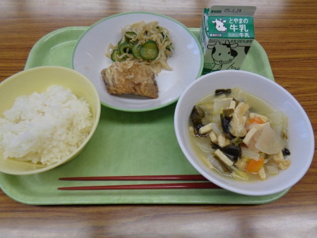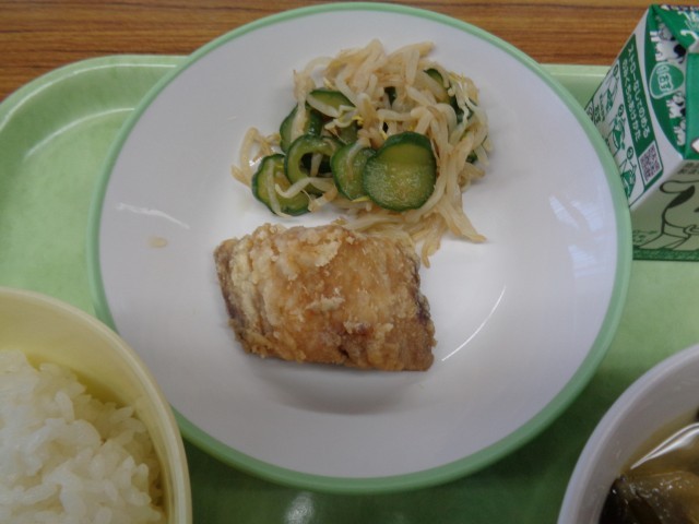 今日のメニューは、ごはん、牛乳、あじのかば焼き、もやしのおひたし、高野豆腐のみそ汁でした。みそ汁には、高野豆腐の他にもたくさんの具材が入っていました。美味しくいただきました。
