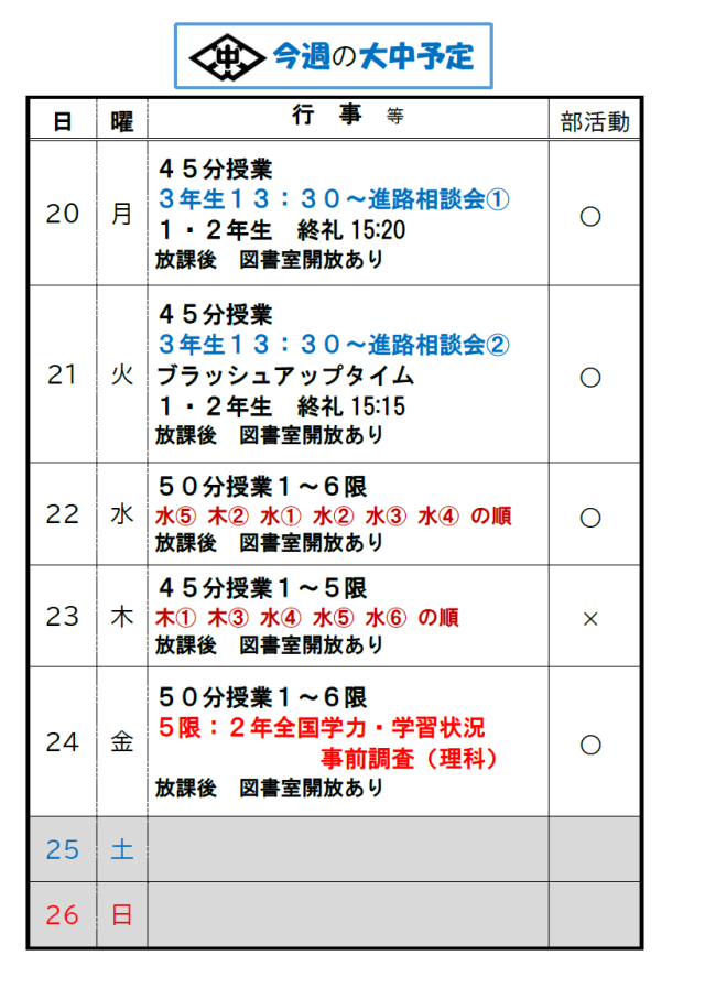 今週は、20日(月)・21日(火)に3年生は進路相談会があります。家庭で進路について本人と保護者でしっかりと話し合ってから、懇談会に臨んでください。