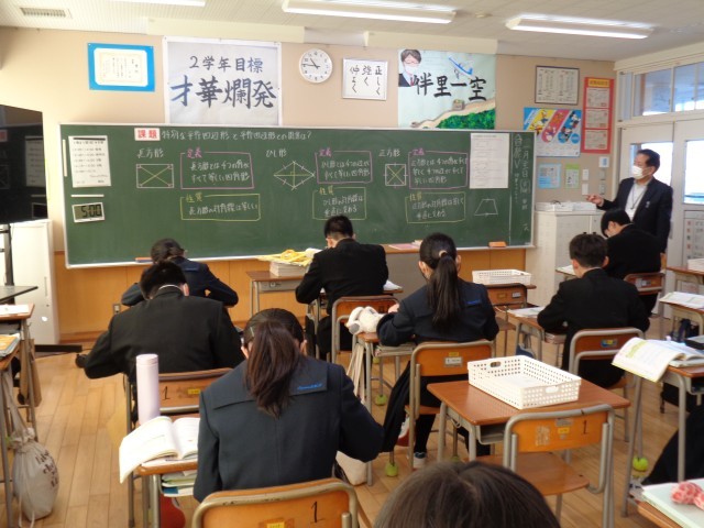 2年生の数学と社会です。数学では、平行四辺形の条件を学習していました。