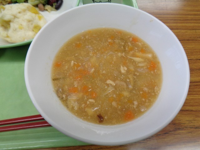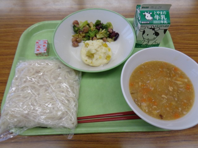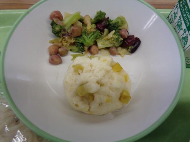 メニューは、ソフト麺、牛乳、ソフト麺の肉みそ、蒸しパン、ビーンズサラダ、ポケットチーズでした。久しぶりのソフト麺、3年生にとって最後のソフト麺?かもしれません。美味しくいただきました。