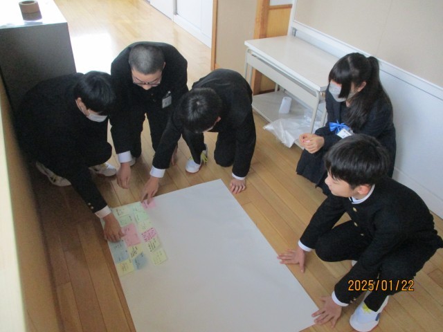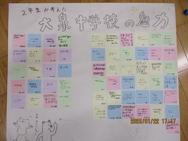 今日の道徳の時間に「誇りを胸に 47年に感謝を込めて」という題材をみんなで読みました。この話は、取り壊されることになった学校の生徒たちが学校のシンボルや自慢等について考え、学校に誇りや敬愛の気持ちをもつという内容でした。この話をもとに、生徒一人一人が大中の魅力を考えました。「生徒が主体となって活動する」「すてきな友達に出会えた」など、たくさんの素敵な意見が出されました。