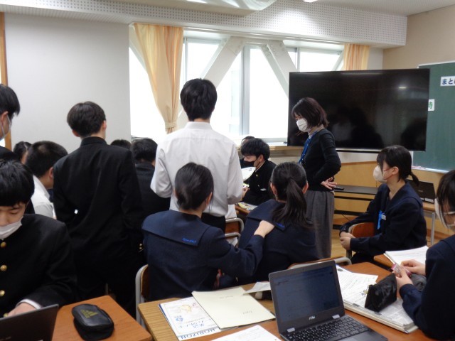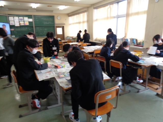 3年生の授業です。英語ではALTを囲んで、楽しく会話をしていました。美術では、各自真剣に作品制作を行っていました。