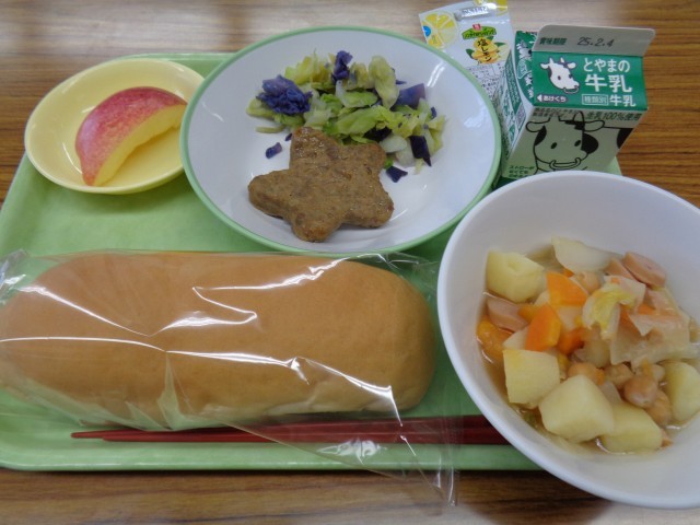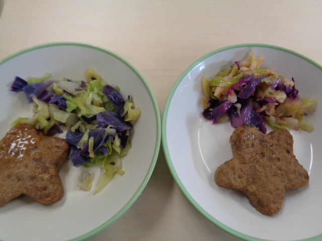 学校給食週間2日目です。今日のメニューはコッペパン、牛乳、星形ハンバーグ、サイエンスサラダ、根茎葉のポトフ、リンゴ、塩レモンドレッシングでした。今日は理科の献立です。ドレッシングをかけると、サラダの色が変わりました。左がかける前、右がかけた後です。色の変化を楽しんで、美味しくいただきました。