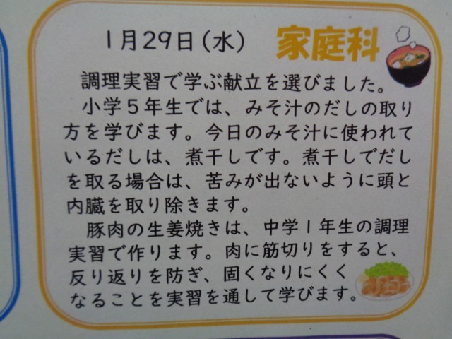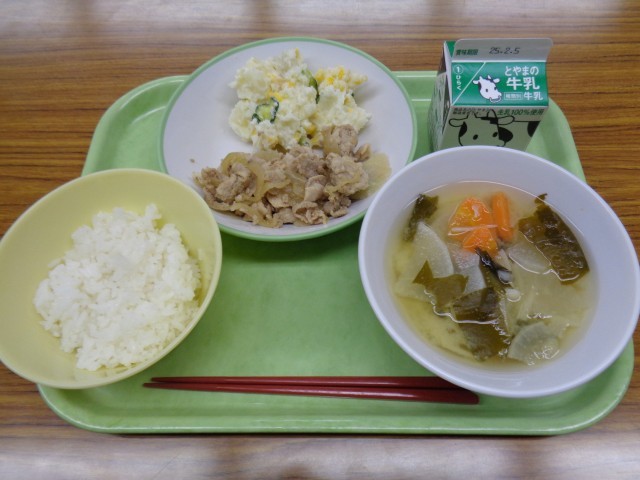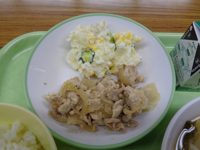 学校給食週間3日目です。今日は家庭科です。調理実習で学ぶ献立です。メニューはごはん、牛乳、豚肉の生姜焼き、ポテトサラダ、みそ汁でした。美味しくいただきました。