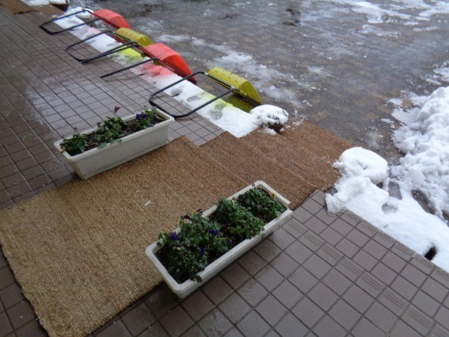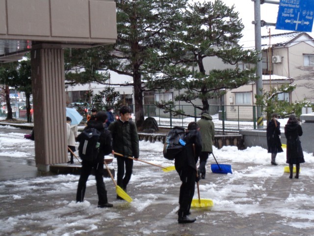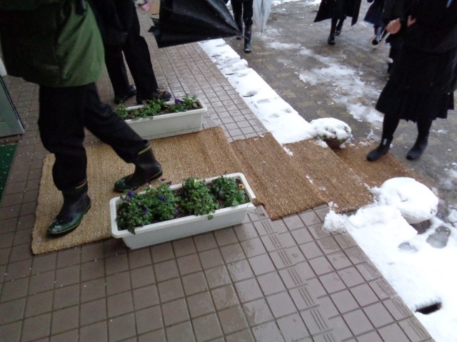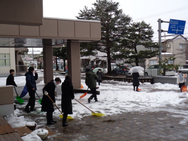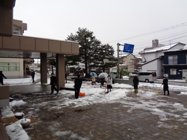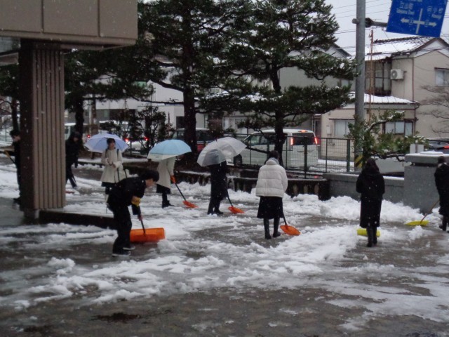 今朝は久しぶりに積雪があったので、除雪をしました。当番が決まってますが、ボランティアで参加した人もたくさんいました。ありがとうございます。生徒玄関前が積雪時に滑りやすく危険なので、滑り止めのござを敷きました。